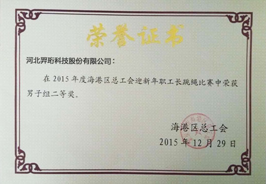 2015年12月29日上午,在海港區(qū)總工會舉辦的迎新年職工長跳繩比賽中,羿珩職工發(fā)揮團(tuán)隊精神,在參賽的200名各單位職工團(tuán)體中,經(jīng)過數(shù)輪比拼、一路過關(guān)斬將,最終榮獲男子組二等獎。
