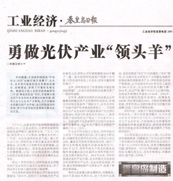 開(kāi)欄的話:在國(guó)家積極推進(jìn)“中國(guó)制造2025”戰(zhàn)略實(shí)施大背景下,近年來(lái),我市現(xiàn)代化裝備制造業(yè)發(fā)展超前謀劃、統(tǒng)籌推進(jìn),取得了可喜的發(fā)展業(yè)績(jī)。秦皇島日?qǐng)?bào)工業(yè)經(jīng)濟(jì)信息版將專門開(kāi)設(shè)“秦皇島制造”專欄,全面展示我市現(xiàn)代裝備制造業(yè)發(fā)展的創(chuàng)新思路,展現(xiàn)企業(yè)立足自身產(chǎn)業(yè)基礎(chǔ),大力實(shí)施技術(shù)創(chuàng)新引領(lǐng)產(chǎn)業(yè)升級(jí)、全力開(kāi)拓國(guó)內(nèi)外市場(chǎng)、努力為全市經(jīng)濟(jì)發(fā)展做貢獻(xiàn)的生動(dòng)實(shí)踐。