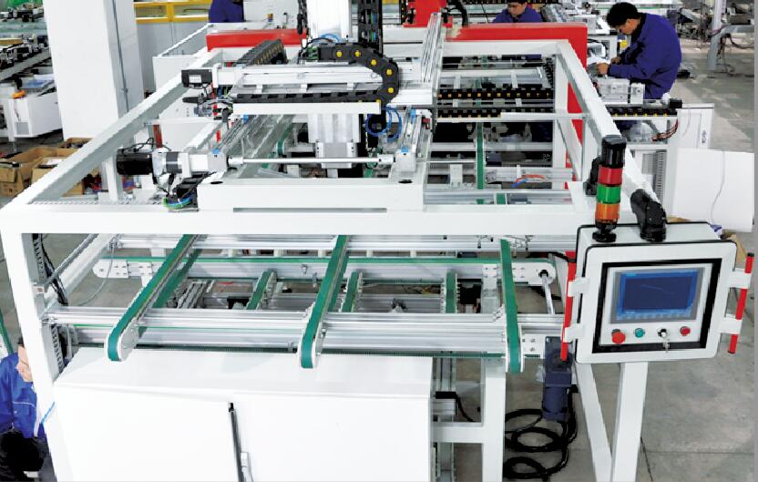 此設(shè)備用于將自動(dòng)串焊機(jī)串焊好的電池串,按照工藝尺寸要求和排版方向順序自動(dòng)排版鋪設(shè)到玻璃/EVA上,組成電池串陣列。玻璃/EVA通過傳輸線傳輸至指定位置,并進(jìn)行機(jī)械定位,四軸機(jī)械手抓取電池串實(shí)現(xiàn)智能相機(jī)檢測(cè)缺陷、定位、自動(dòng)旋轉(zhuǎn)、自動(dòng)排版功能。設(shè)備通過同步帶傳輸與自動(dòng)生產(chǎn)線對(duì)接,實(shí)現(xiàn)了自動(dòng)流水作業(yè)。